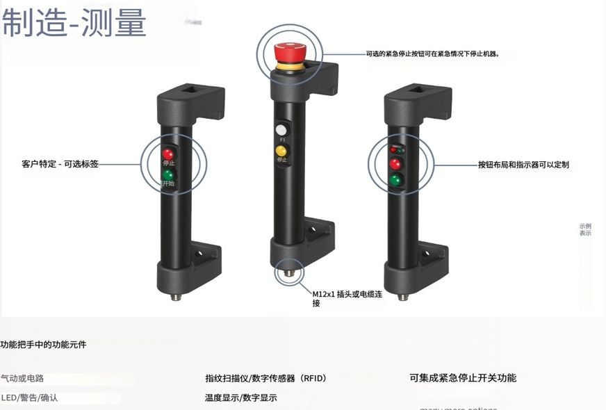 以上FG12-LL系列緊湊型功能手柄,帶有三色發(fā)光手柄桿,LED顏色是紅色,例如:可以使用黃色和綠色,顯示機(jī)器的相應(yīng)運(yùn)行狀態(tài),另外關(guān)于手柄的材料和表面,聚酰胺PA6手柄,黑色,結(jié)構(gòu)精細(xì),握把由鋁合金橢圓型材ALmgsi0.5制成,玻璃球噴射和天然顏色氧化,透光性塑料襯墊,由半透明PMMA制成。另外接線(xiàn),連接管5米叢手柄的螺釘孔中伸出,根據(jù)要求提供8針插頭。
